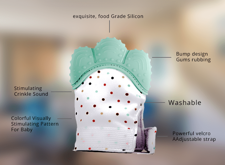 Engaging and Calming:With acolorful design and playful sounds, our gloves not only soothe teething discomfort but also keep your baby entertained.